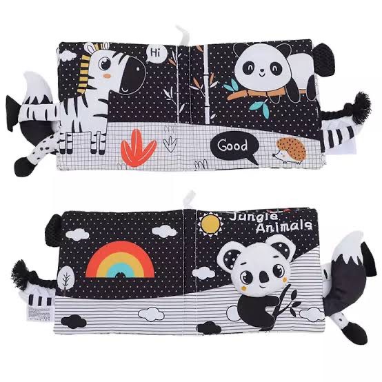 Libro sensorial de tela en blanco y negro diseñado para estimular la visión del recién nacido. Con texturas suaves y elementos interactivos, ideal para el desarrollo temprano del bebé desde 0 meses.