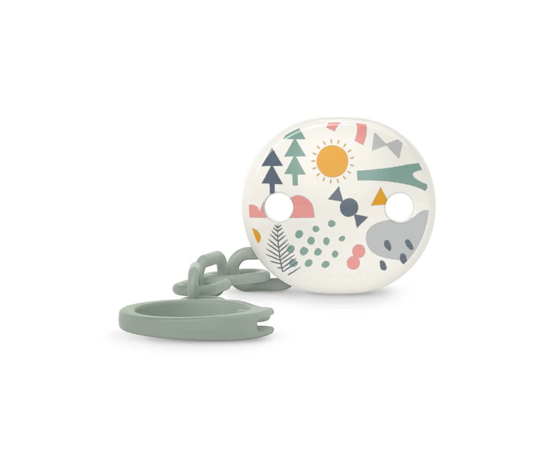 Broche para colgar chupones combinable con los nuevos modelos de chupones, portachupones y biberones de la colección Prints de Suavinex.